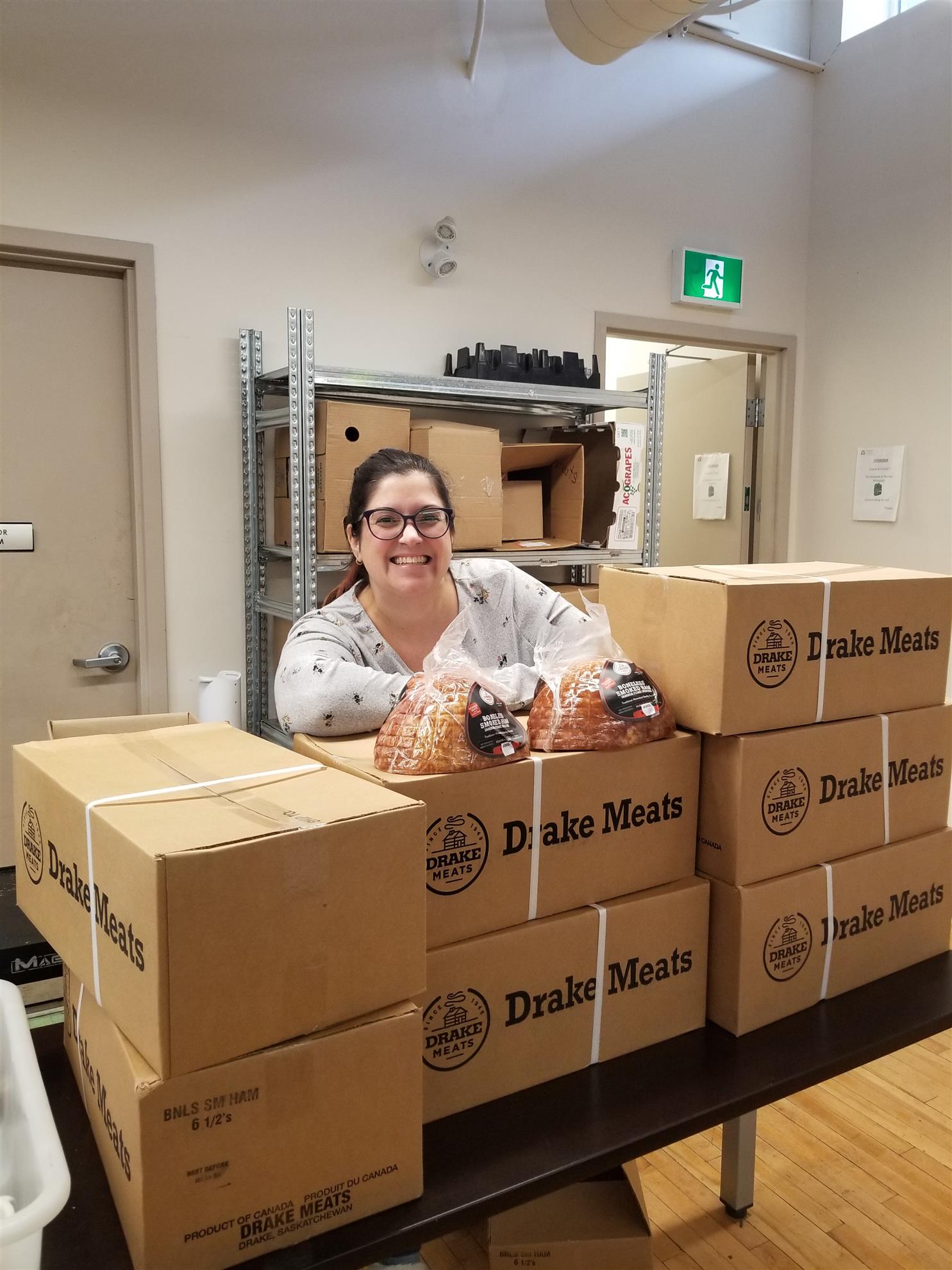 Smiling Lady with Carmichael Outreach was there to Welcome Jayna Amadasun's Delivery of 44 Donated Hams